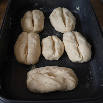 Teig fällt leicht aus dem Topf - Teiglinge in ca. 8 Stücke teilen, zu Brötchen formen und einschneiden.